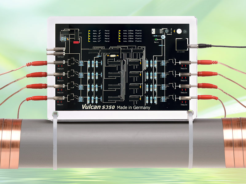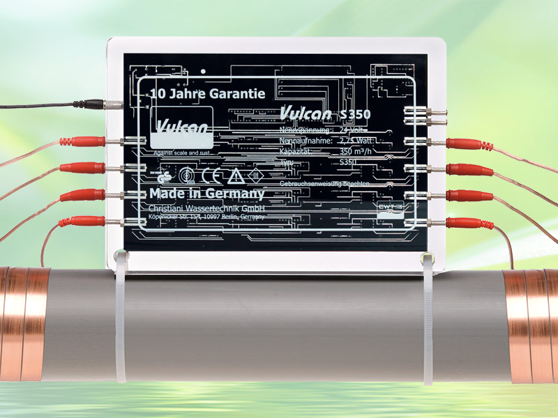 Vulcan is an eco-friendly water treatment system that protects your piping system and appliances against scale deposits and rust. The Vulcan-Impulse-Technology is based on the principle of physical water treatment. Special electronic impulses change the crystallization process of the liquid calcium. This way the hard scale loses its adhesive power. The technology works exclusively with capacitive electric impulses: