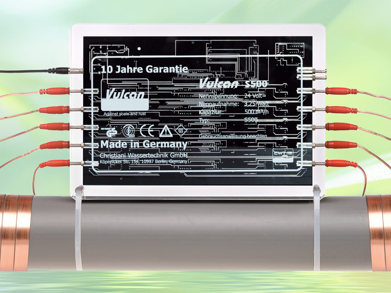 Vulcan is an eco-friendly water treatment system that protects your piping system and appliances against scale deposits and rust. The Vulcan-Impulse-Technology is based on the principle of physical water treatment. Special electronic impulses change the crystallization process of the liquid calcium. This way the hard scale loses its adhesive power. The technology works exclusively with capacitive electric impulses: